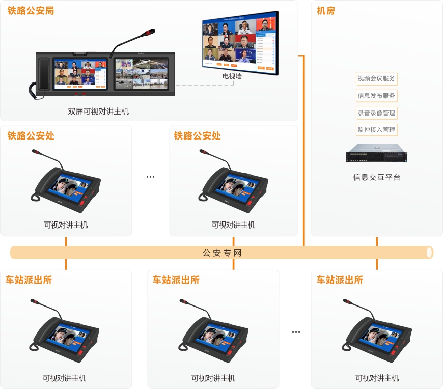 铁路公安部门工作所涉及的范围越来越广,执法工作量日益增加,公众对铁路公安部门的工作效率、反应及应变能力等提出了更高的要求。同时,各机关之间地理跨度较远,日常勤务沟通较频繁,需建立一套“局--处--所”三级架构互联互通的“音视讯”通讯指挥系统,实现及时便捷的沟通交流,提升铁路公安局、铁路公安处、车站派出所之间日常沟通效率和应急处置能力。