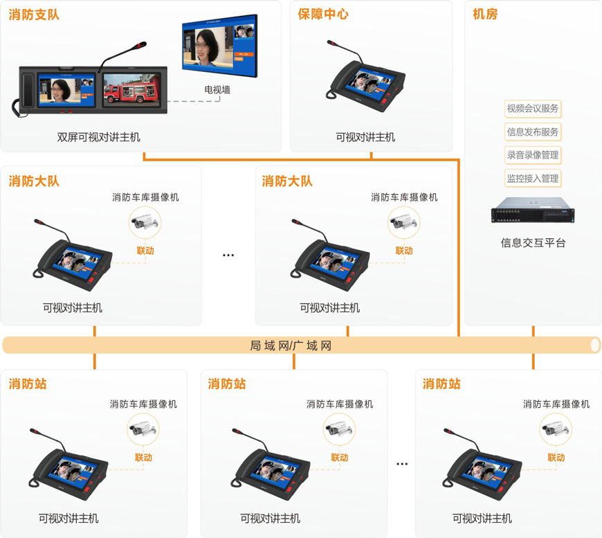系统基于IP网络架构,以高清音视频通讯技术为核心,构建了一套功能完善、实时性高、扩展性强的联网式音视频实时交互平台,实现消防支队指挥中心通过现有消防平台联动对讲系统、到达与消防大队、各消防站之间的快速建立视频通话、视频会议、录音录像、通知发布等功能。
